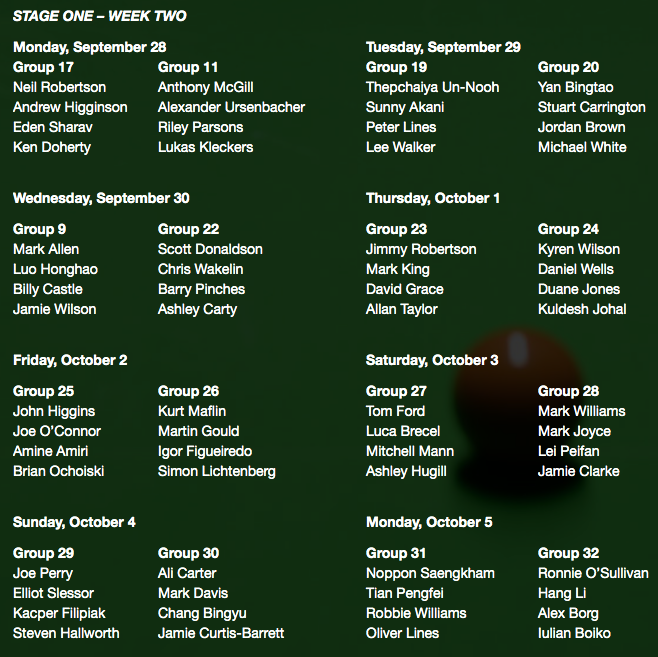 Световният шампион Рони О’Съливан ще се включи в надпреварата в група 32 на 5 октомври, като в неговата компания са Хан Ли, Алекс Борж и Юлиан Бойко.