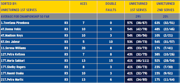 Според статитиката Пиронкова е направила общо 7 аса и 0 двойни грешки в двата си мача дотук. Тя обаче е №1 по процент невърнати от съперничките начални удари - 57% за първи сервис и още по-впечатляващия показател 63% за втори сервис.
