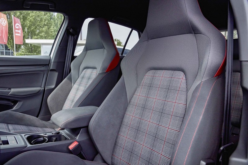 Неповторимият стил на GTI. Типичните за GTI детайли са запазени и в новото осмо поколение на спортния модел. Доказалият се във времето класически кариран десен на тапицериите се отличава със свежа стилистична интерпретация и естествено се използва при изцяло новоразработените спортни седалки. В новия Golf вече няма ключ за запалване - той е заменен от Start/Stop бутон (част от стандартното оборудване), който след отваряне на вратите на GTI започва да пулсира в червено, докато двигателят не се стартира. Класическото изпълнение на спортния волан с три спици е трансформирано в нов, облицован с кожа мултифункционален спортен волан със сензорни панели и опционален бутон Travel Assist за включване на системите за асистирано шофиране на Golf със скорост до 210 км/ч.