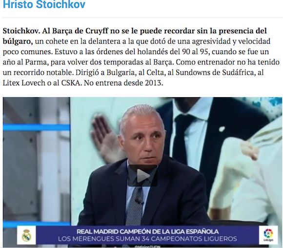 “Барса на Кройф няма как да бъде запомнен без присъствието на българина. Той беше като ракета в атака и се отличаваше с невероятна агресия и бързина. Стоичков играеше за тима под ръководството на нидерландеца от 1990 до 1995 г., после изкара един сезон в Парма, след което се завърна за нови две години. Кариерата му на треньор обаче не е впечатляваща. Той беше начело на националния тим на България, Селта, Мамелъди Съндаунс, Литекс или ЦСКА. Не е бил наставник от 2013 г. година насам.”