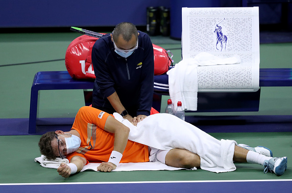 След края на четвъртия сет Кареньо Буста поиска да се възползва от услугите на физиотерапевт, тъй като имаше физически проблеми, вероятно болки в кръста. След подновяването на играта испанецът бе пробит още в първото си подаване в петия сет. Нещата вече изглеждаха коренно различни в сравнение с картината от първите два сета, като Зверев затвърди пробива за аванс от 2:0 и все по-уверено вървеше към класиране на финала. Кареньо Буста успяваше да взима геймовете, в които сервираше, но не съумяваше по никакъв начин да затруднява Зверев в подаванията на германеца. Така се стигна до 5:3 за германеца и сервиращият Кареньо Буста не издържа. Испанецът отрази един мачбол с великолепен и смел печеливш удар от форхенд, но при втората точка за спечелване на мача се предаде и US Open 2020 има своя първи финалист при мъжете в лицето на Зверев.