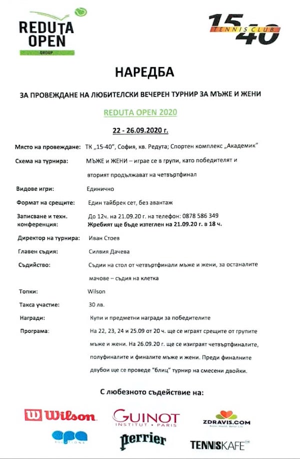 Вечерният тенис турнир “Редута Оупън” започна на 22 септември със специално откриване и серия от мачове. След тегленето на жребия се изиграха няколко срещи от основната схема, а в клуб “15-40” в спортен комплекс “Академик” се събраха десетки фенове, пише Tenniskafe.com. Състезателите видяха наградите и купите, които ще получат, а също така се насладиха на посрещане с коктейл от страна на организаторите.