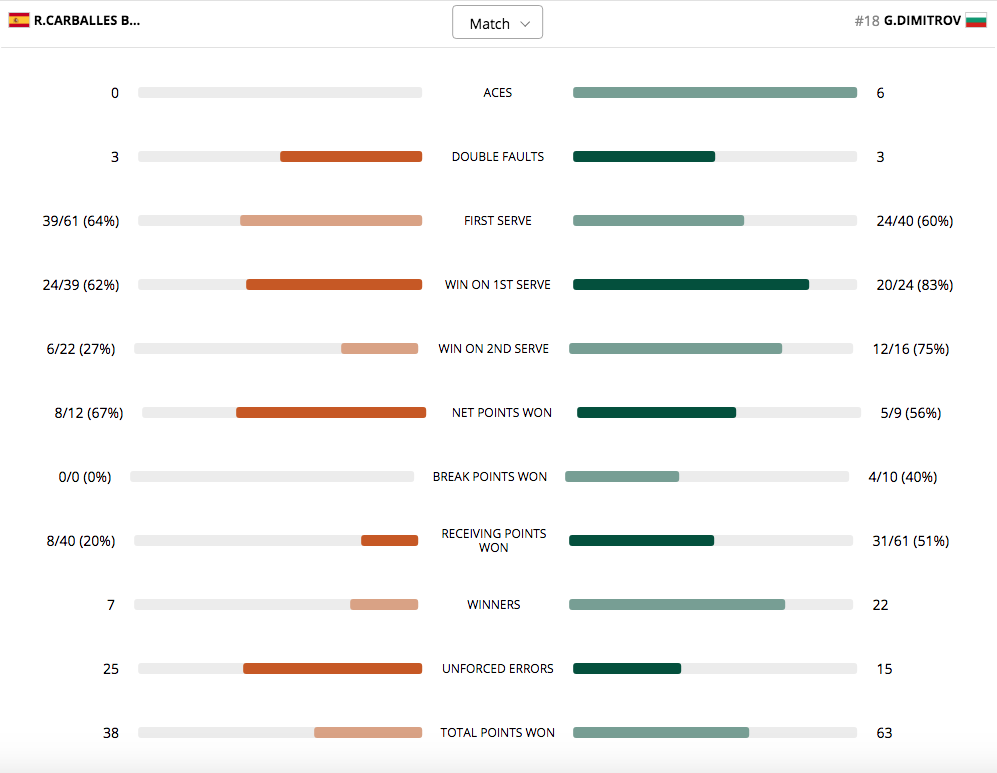 Карбайес Баена в предишния кръг бе постигнал най-голямата победа в кариерата си, елиминирайки деветия в света Денис Шаповалов в петчасова и петсетова драма. Испанецът бе прекарал общо около 7 часа и половина на кортовете в Париж, а в същото време от юли миналата година не бе печелил два поредни двубоя в един турнир преди “Ролан Гарос”. Голямото му физическо натоварване оказа влияние и той прецени, че няма аргументи да се съревновава още с Димитров след бързо загубените два сета.