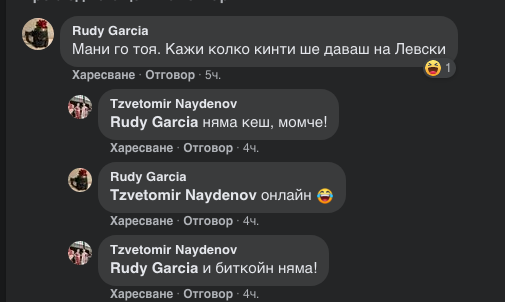 На собственика на компанията за спортни залози efbet – Цветомир Найденов, който е сред известните привърженици на ЦСКА, беше зададен любопитен въпрос в социалната мрежа "Фейсбук". Бизнесменът и силен човек в ЦСКА 1948 беше попитан от запалянко: "Кажи колко кинти ще даваш на Левски?". Отговорът на Найденов беше кратък и отрицателен: "Няма кеш".