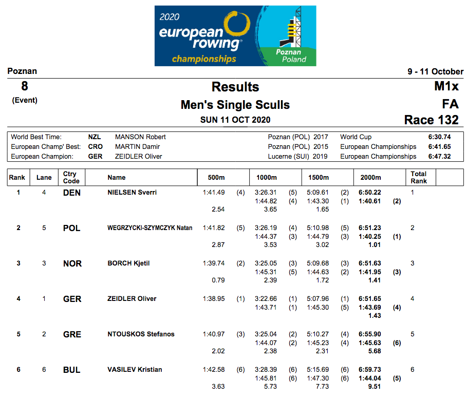 Европейската титла грабна датчанинът Свери Ниелсен с време 6:50.220 минути. Среброто остана за Натан Вегрицки-Шимчик от Полша с време 6:51.230 мин.