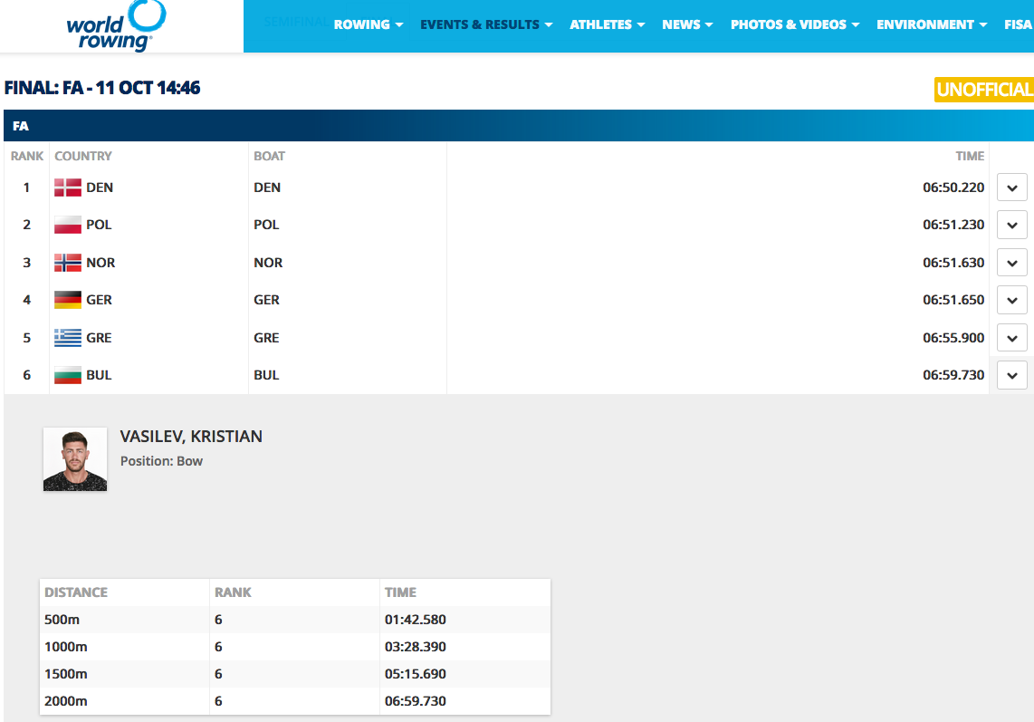 Василев се движеше на 6-а позиция на всички контроли и измина дистанцията от 2000 метра за 6:59.730 минути.