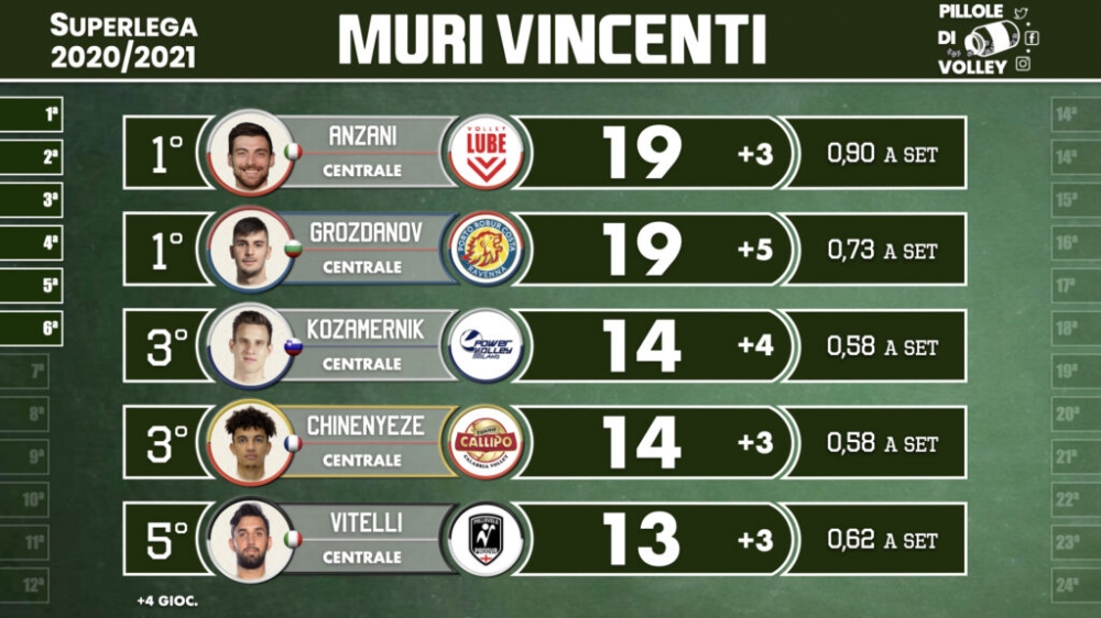 След изиграването на двубоите от 6-ия кръг от Серия А1 ри блокировачите Алекс Грозданов дели лидерската позиция със Симоне Анцани от Лубе.