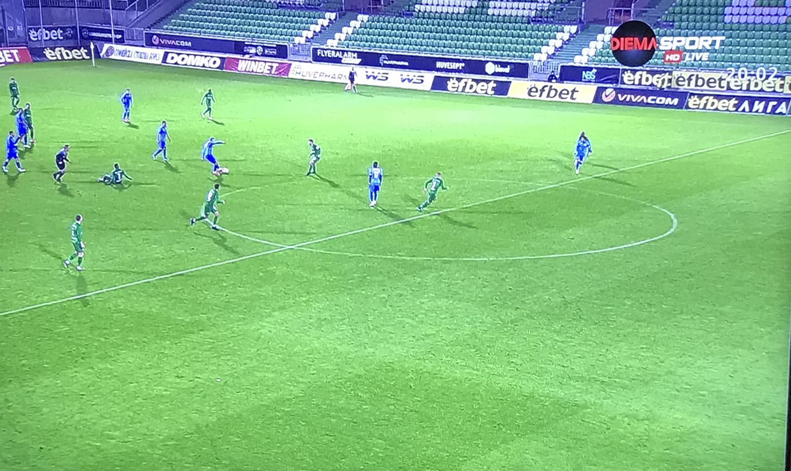 Буквално в последната секунда на първата част Краев с майсторско подаване изведе Здравко Димитров сам срещу Илиев, но реферите сбъркаха и вдигнаха в засада.
