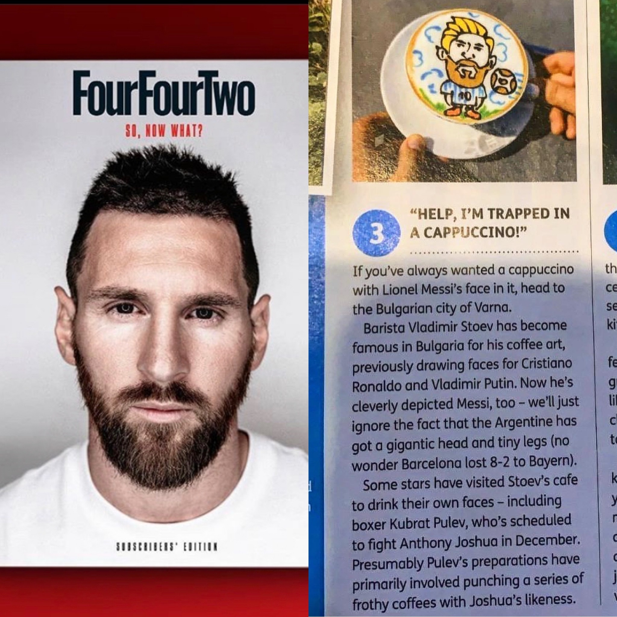 „Не знам как са попаднали на моето изкуство. Изключително съм щастлив, че са оценили това капучино с Меси. За мен е огромно признание да попадна в списание като това.”, сподели пред Sportal.bg Владимир Стоев.