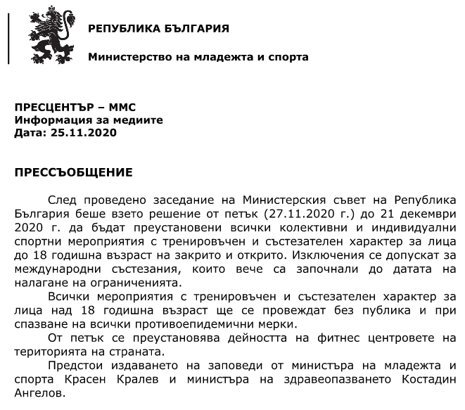 След заседание на Министерски съвет обаче е взето решение, да бъдат преустановени спортните и тренировъчните мероприятия за лица до 18-годишна възраст. Мерките влизат в сила от 27 ноември и ще продължат до 21 декември.