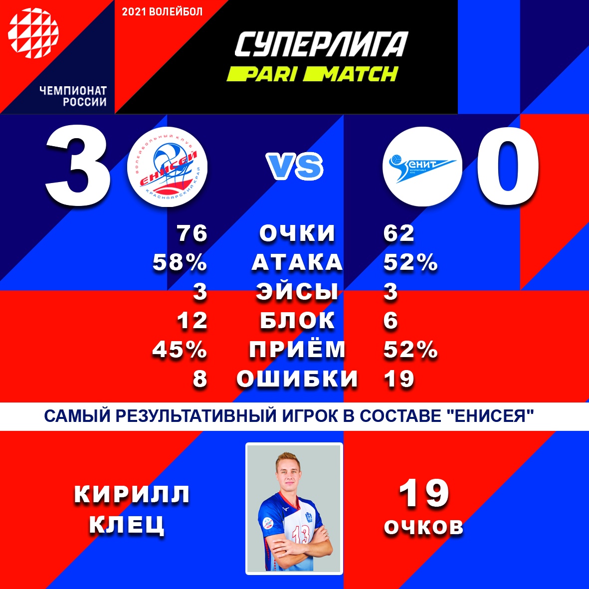 Тодор Скримов игра много силно и записа 14 точки (3 аса, 50% ефективност в атака, 48% перфектно и 52% позитивно посрещане). Най-резултатен за успеха на Енисей стана бившият волейболист на Монтана Кирил Клец, който се завърна в игра след дълго лечение ан контузия, с 19 точки (3 блока, 67% ефективност в атака). Ян Ерещенко добави още 10 точки (71% ефективност в атака, 29% перфектно и 35% позитивно посрещане).