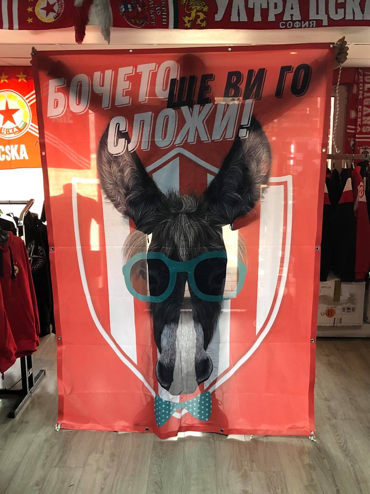 Тарторът на сектор "Г" Иван Велчев показа интересно знаме във "Фейсбук". Кюстендилеца публикува снимка на флаг с лика на магаре, наречено Бочето. Това стана часове преди двубоя между "червените" от стадион "Българска армия" и "червените" от ЦСКА 1948. Нашата медия научи, че идеята за въпросното знаме е на популярен спортен журналист.