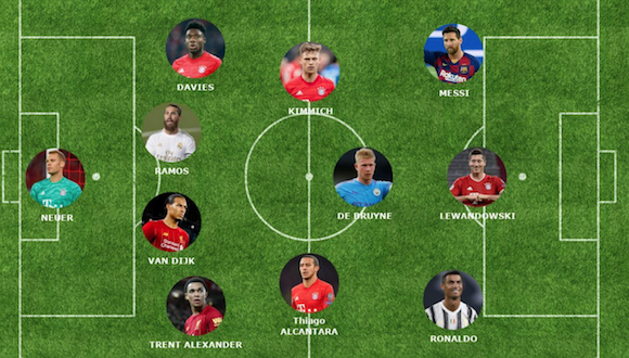 Мануел Нойер (Байерн), Трент Александър-Арнолд (Ливърпул), Вирджил ван Дайк (Ливърпул), Серхио Рамос (Реал М), Алфонсо Дейвис (Байерн), Йошуа Кимих (Байерн), Тиаго Алкантара (Байерн/Ливърпул), Кевин Де Бройне (Ман Сити), Кристиано Роналдо (Ювентус), Лионел Меси (Барселона), Роберт Левандовски (Байерн).