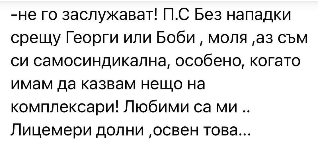 „Хм, за какво мисля... Да се бориш в една Италия, нищо, че.... нямате среща и да се опитват да те омаловажат, да не признават качествата ти или просто да го правят между другото...някак е разбираемо-ти си чужд, иска им се техните да са по-добри, е, ако не са, в крайна сметка ти го признават... На път сме и то втори път да го преживеем... Преди контузията и след нея, но...когато в родната ти страна се правят на олигофрени ми е твърде много!!! Боби се върна, да, след тежка контузия, обаче мачка, мачкаше наред всички, особено неговите набори в националния на България, но... какво стана – тях ги извикаха в мъже, а него – не! Прави ги смешни буквално, обаче той не е в състава.. Така, аз нямам нищо общо с Георги Младенов, освен, че съм му съпруга.. В този ред на мисли, не мога да се въздържа и ще ги нахраня колегите му! Ич ми не е... Роска, гледай си работата, пич – дръж си ги там...не разбирам избора ти, всъщност допускам, че още не си се отърсил от сянката на Младенов – Георги Младенов, кофти за теб... Сега, ако Господ е рекъл да е здрав – Борислав Младенов, ще е още по-добър... Без да ми се сърдите хлапета, обаче – Чернокожев, сори, къде отиваш ти, да качвам ли на какво те направи Борислав а?