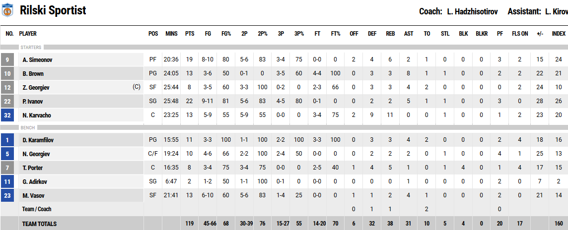 Нико Карвачо записа 13 точки и 11 борби за успеха. Брендън Браун и Мирослав Васов също вкараха по 13 точки. Деян Карамфилов завърши с 11 точки, а Николай Георгиев се включи с 10 точки.