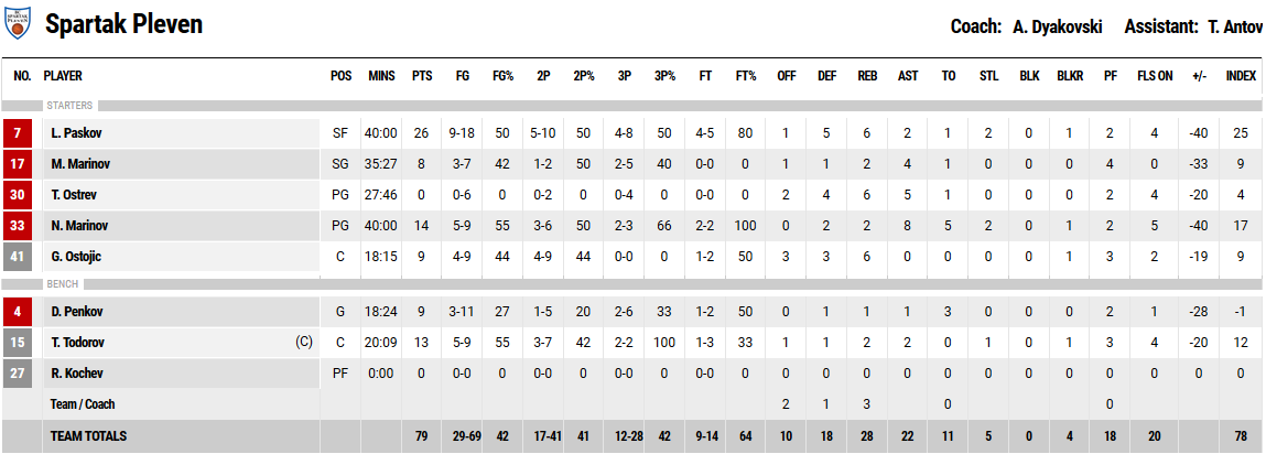 Любен Пасков изигра добър мач за плевенчани и се отличи с 26 точки, като вкара 4 тройки. С 14 точки завърши Николай Маринов, а капитанът Тодор Тодоров добави 13 точки.