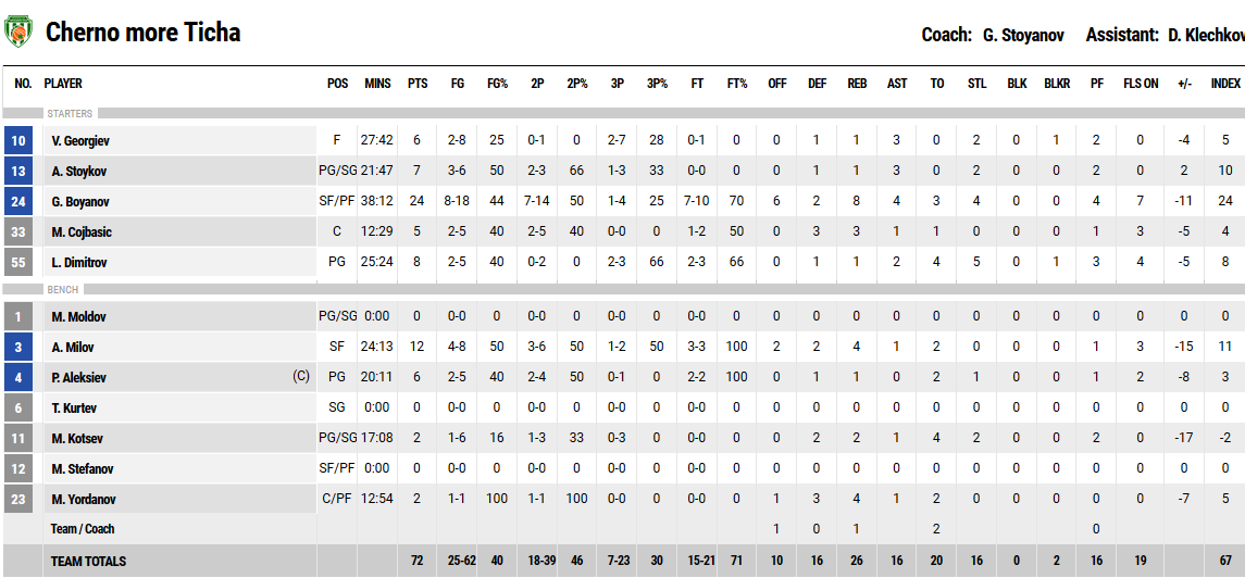 За Черно море нов силен мач изигра Георги Боянов, който записа 24 точки, 8 борби, 4 асистенции и 4 отнети топки. Александър Милов допълни с 12 точки и 4 борби от пейката на варненци.