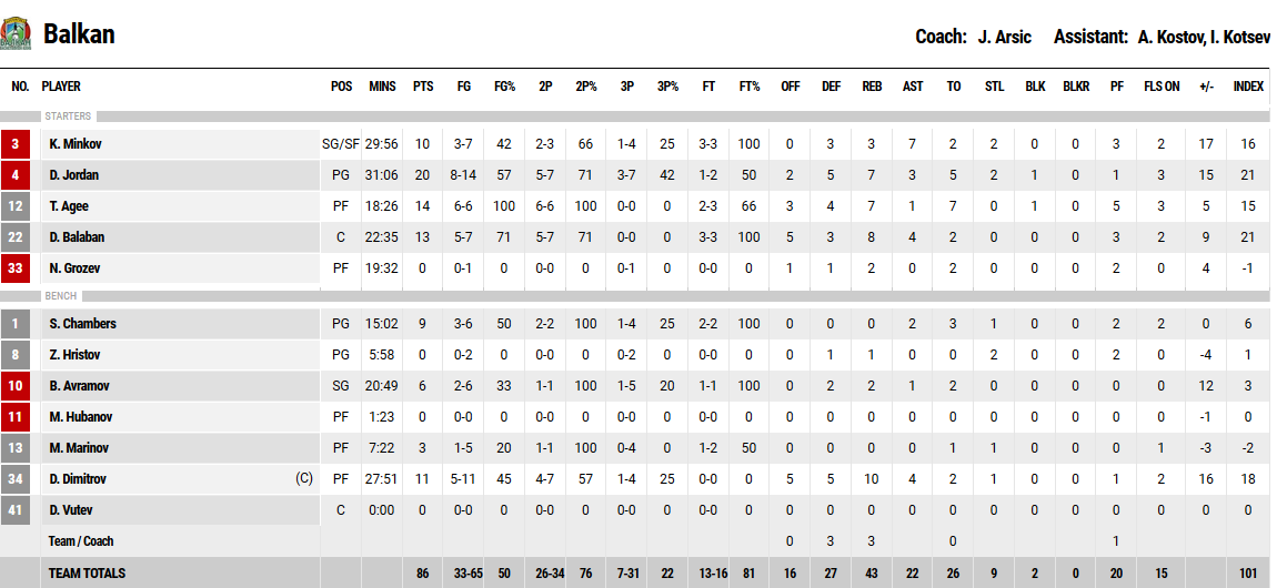 Давонтей Джордан поведе победителите с 20 точки и 7 борби, Тауан Ейджи добави 14 пункта и 7 овладени топки за 18 минути игра, Дарко Балабан се разписа с 13 точки, 8 борби и 4 асистенции, Димитър Димитров оформи "дабъл-дабъл" от 11 точки и 10 борби, а Крис Минков се разписа с 10 точки и 7 асистенции.