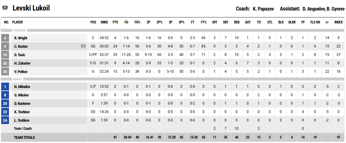 Данило Тасич завърши с 29 точки, 10 борби и 5 асистенции за победата на Левски Лукойл. Чавдар Костов отбеляза 24 точки, а Венцислав Петков се разписа с 15 пункта, 5 борби и 5 асистенции. За Черноморец Дианте Болдуин записа 20 точки, 5 борби и 10 асистенции, Марвин Смит добави 13 точки и 7 борби, а Уендъл Люис реализира 10 точки.
