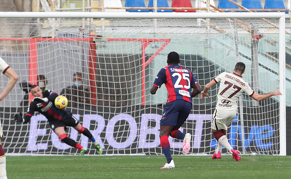 В 35-ата минута резултатът стана 0:3. Рик Карсдорп получи топката на десния фланг и центрира към Майорал, който падна в наказателното поле след съприкосновение с Владимир Големич. Реферът Марко Пичини прецени, че сръбският защитник на Кротоне е извършил нарушение и посочи бялата точка. Мхитарян изпълни дузпата и въпреки че Кордас позна ъгъла и не бе далеч от това да спаси удара, арменецът реализира попадение.