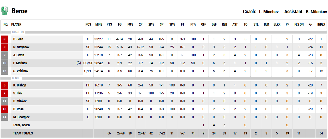 БЕРОЕ: Джеймс Гавин 7, Николай Стоянов 15, Павел Маринов 6, Дерик Джийн 11, Станислав Ваклинов 6 (Брейди Роуз 9, Кейлъб Бишъп 7, Симеон Илиев 5)