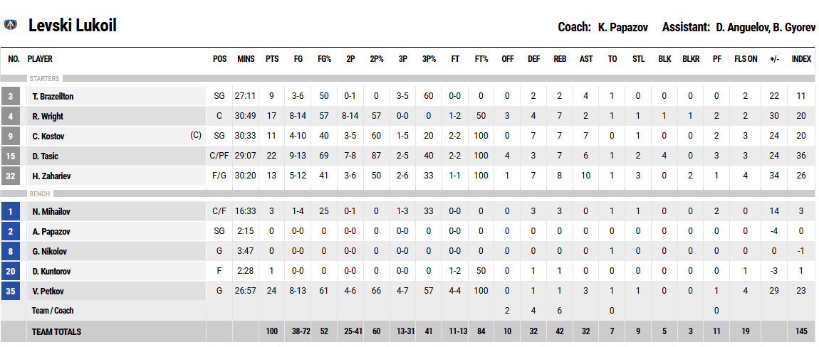ЛЕВСКИ ЛУКОЙЛ: Тайрън Бразелтън 9, Чавдар Костов 11, Христо Захариев 13, Райън Райт 17, Данило Тасич 22 (Венцислав Петков 24, Николай Михайлов 3, Даниел Кунторов, Герасим Николов)