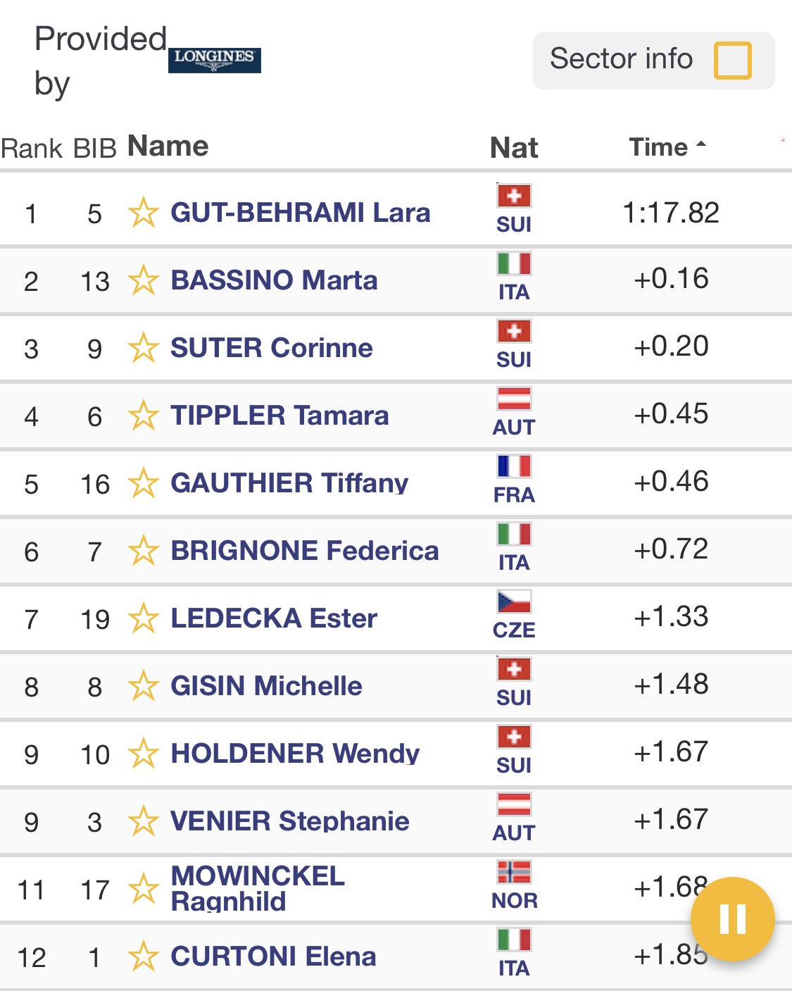 След днешното второ от общо осем състезания в дисциплината Супер-Г през сезона, лидер в класирането за малкия кристален глобус със 145 точки е Гут-Берами, която е следвана от Ледецка и Зутер, които имат по 140 пункта. В генералното класиране Петра Влъхова (Словакия), която днес завърши 19-та след много сериозна грешка в средата на трасето, остава водачка с актив от 649 точки и преднина от 119 пред осмата от днес Мишел Гизин (Швейцария) докато трета на 226 пункта зад словачката е Басино.