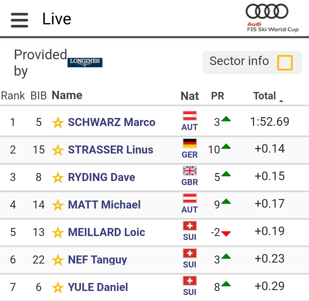 Шварц бе четвърти след сутрешния първи манш с изоставане от 0.43 спрямо водача след него, но направи много чисто второ минаване на трасето и се поздрави със своя трети успех в стартове за Световната купа в своята кариера. Втори днес с изоставане от 0.14 остана победителят от слалом в Загреб (Хърватия) в сряда Линус Щрасер, който спечели цели десет места във втория манш. Тройката запълни Дейв Райдинг (Великобритания), който остана на само 0.01 зад Щрасер.