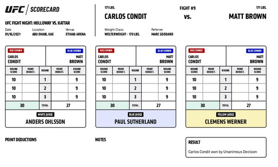 В третия рунд Карлос вкара удар в слабините на Браун и битката беше спряна за кратко. Двамата влязоха в клинч и пренесоха боя на земята, където Кондит имаше по-добрите положения и срещата стигна до решение. Съвсем изненадващо с оглед на случилото се съдиите отсъдиха единодушна победе в полза на Кондит -