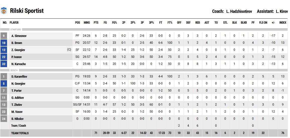 За Рилски Павлин Иванов бе точен с 14 точки и 5 борби, Брандън Браун остана с 12 точки, а Тихомир Желев завърши двубоя с 11 точки.
