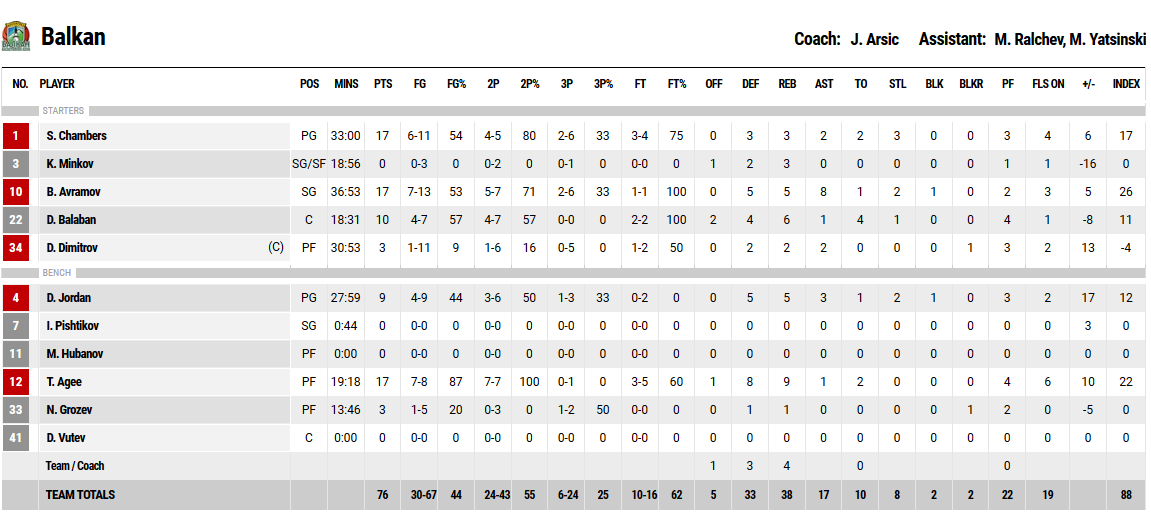 БАЛКАН: Сияни Чеймбърс 17, Крис Минков, Божидар Аврамов 17, Димитър Димитров 3, Дарко Балабан 10 (Тауан Ейджи 17, Давонтей Джордан 9, Николай Грозев 3, Илиян Пищиков)