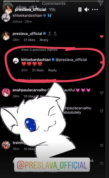Именно един от екзотичните фотоси на Клои Кардашиян коментира и родната поп-фолк звезда Преслава, която пък е на романтична ваканция в Турция. Преслава пусна два стикера с надпис “top”, а приятелката на баскетболиста от НБА Тристан Томпсън побърза да й отговори с четири сърца. Последва поредица от коментари от български фенове, а самата Преслава се похвали в свое стори с новото си приятелство.