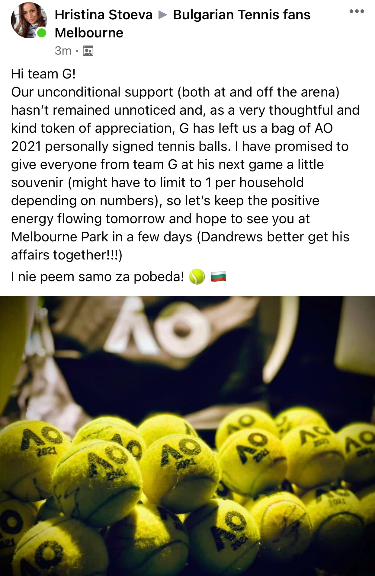 Нашата безусловна подкрепа (на и извън арената), не остана незабелязана. Като много мил знак на благодарност, Григор ни подари торба с тенис топки от Australian Open, подписани лично от него. Обещавам да дам на всеки от "Отбор Г" по един сувенир по време на следващия му мач (може би ще трябва да има лимит от 1 топка на семейство, зависи от броя хора). Така че нека запазим позитивната енергия и дано се видим след няколко дни на "Мелбърн парк" (Д. Андрюс да си опича акъла (б.р. премиерът на Виктория)).