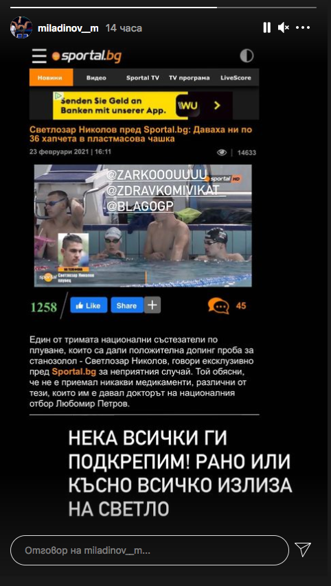 Един от лидерите на националния отбор по плуване Антъни Иванов организира онлайн среща в “Инстаграм” с тримата уличени в употреба на допинг свои съотборници - Здравко Баблаков, Благой Панайотов и Светлозар Николов. . 21-годишният Антъни, който учи и тренира в САЩ, заяви, че ги подкрепя и че следващата седмица ще коментира скандала, тъй като в момента вниманието му е насочено изцяло към състезанията, които му предстоят.