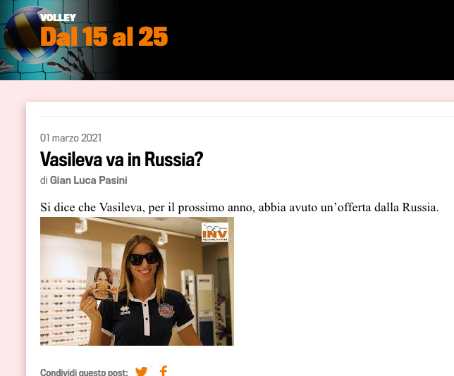 Капитанът на националния отбор на България по волейбол за жени Елица Василева има оферта да продължи кариерата си в Суперлигата на Русия, твърди Джан Лука Пазини в блога си в La Gazzetta dello Sport.