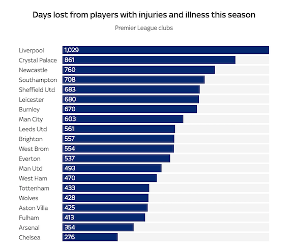 Иначе Клоп има пълното право да се оправдава с отсъстващи футболисти, защото статистиката показва, че през настоящия сезон Ливърпул е тимът с най-много играчи, които не са взели участие в мачовете от Премър лийг заради травми или заболявания. Състезатели на шампионите са пропуснали общо 1029 дни по тези причини, а най-близо до тях е Кристъл Палас, чийто играчи не са били на разположение в общо 861 дни. На другия полюс е Челси с едва 276 дни.