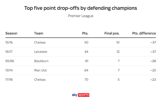 В същото време Ливърпул рискува да влезе в историята като шампиона на Премиър лийг, който е допуснал на-голям срив в сезона, в който е защитавал титлата си. Става дума за разликата в точките между шампионската кампания и последвалата такава. Засега най-голяма е амплитудата при Челси и Лестър при титлите им от 2015 и 2016 г. И двата отбора са спечелили с по 37 точки по-малко в следващите сезони. През миналата година Ливърпул триумфира на върха с 99 точки, а в момента е с 43. До края “червените” от “Анфийлд” имат да изиграят още само десет срещи, в които трябва да стигнат до поне 20 точки, за да не се наредят до Челси или Лестър (при 19 спечелени до края) или дори да поставят нов антирекорд (при по-малко от 19 спечелени до края).