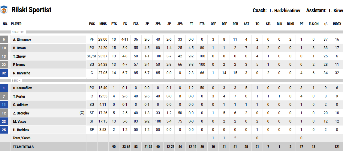 Цели шестима баскетболисти на Рилецо завърши срещата с двуцифрен точков актив. Брандън Браун приключи с 15 точки и 7 асистенции, Нико Карвачо записа "дабъл-дабъл" от 14 точки и 15 борби, Тихомир Желев, Павлин Иванов и Мирослав Васов добавиха по 13 точки, а Алекс Симеонов приключи с 10 точки и 11 борби.