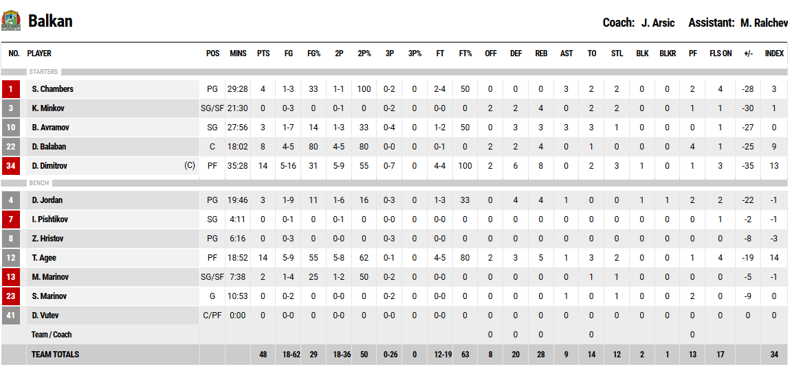 БАЛКАН: Сияни Чеймбърс 4, Божидар Аврамов 3, Крис Минков, Димитър Димитров 14, Дарко Балабан 8 (Тауан Ейджи 14, Давонтей Джордан 3, Марин Маринов 2, Здравко Христов, Станимир Маринов, Илиян Пищиков)
