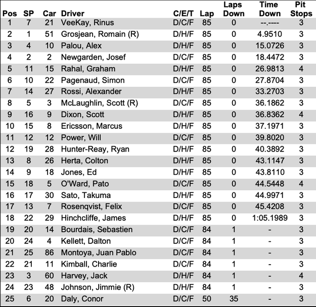 Най-много време му коства борбата с Такума Сато (Rahal Letterman Lanigan Racing), който едно защитаваше своята позиция в обиколката на водача, което е позволено в Индикар, а след това и с много агресивна маневра си върна обиколката, която загуби. След спирането на Виикей за трети и последен път, Грожан отново остана по-дълго на трасето, но настигна много трафик, докато пилотът на Ed Carpenter Racing разполагаше с чиста писта и така успя да увеличи своя аванс спрямо французина след неговото спиране. До края на надпреварата разликата между двамата се стабилизира и на финала тя бе 4.9 секунди в полза на Виикей.