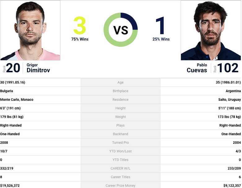 Мачът между поставения под №4 Григор Димитров и Пабло Куевас е четвърти в програмата на централния корт и няма да започне преди 19:00 часа българско време. До момента двамата са се срещали четири пъти, като балансът в съперничеството им е 3-1 победи в полза на Димитров.