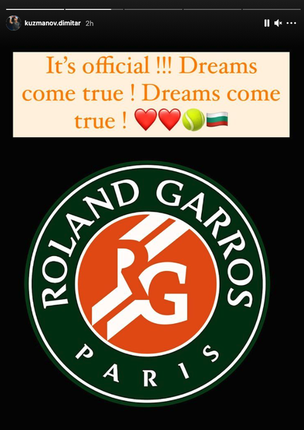 "Официално е! Мечтите се сбъдват! Meчтите се сбъдват!", написа Кузманов в “Инстаграм”, след като организаторите потвърдиха официално за включването на българина в пресявките на "Ролан Гарос".