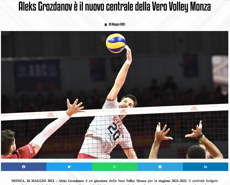 Националът Алекс Грозданов вече е волейболист на Веро Волей (Монца) за сезон 2021-2022. 23-годишният централен блокировач през миналите два сезона игра страхотно за Консар (Равена).