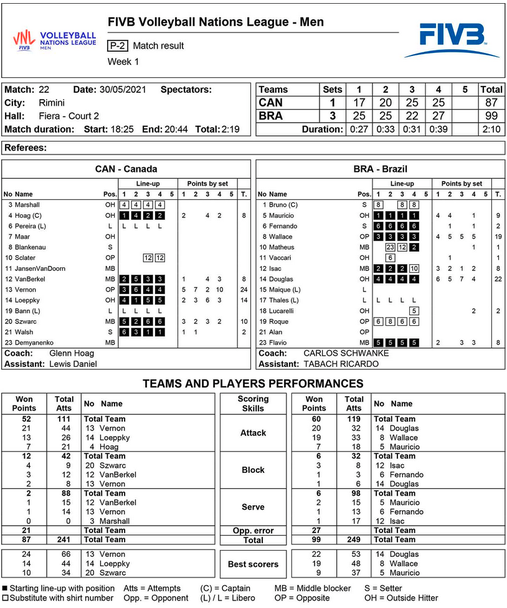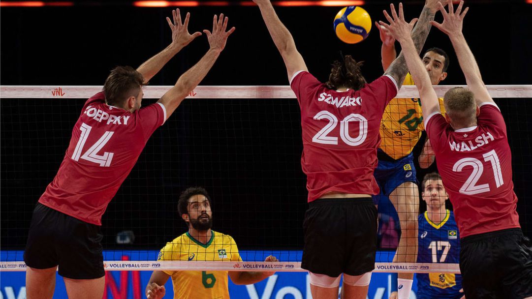 Мъжкият национален отбор по волейбол на Бразилия записа трета поредна победа в тазгодишното издание на Лигата на нациите. Състезателите на Карлос Шванке се наложиха над Канада с 3:1 (25:17, 25:20, 22:25, 27:25) в третия си двубой от надпреварата в Римини (Италия).
