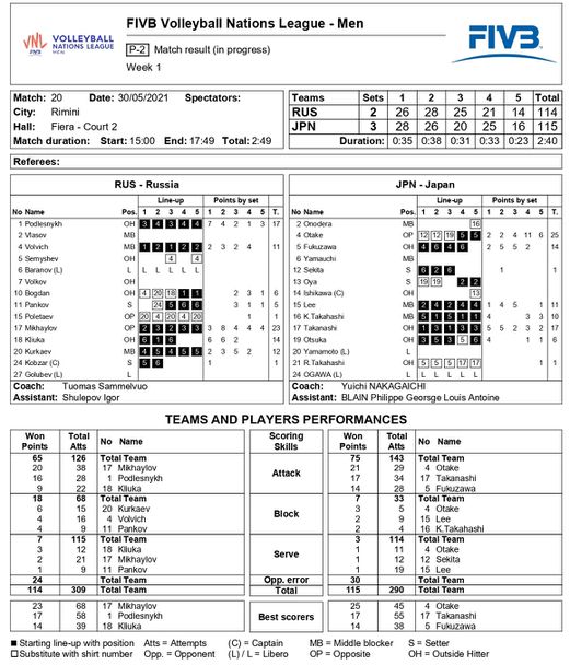 Най-резултатен бе Исей Отаке с 25 точки (1 ас, 3 блокади), Кента Таканаши приключи със 17 точки. Тацуя Фукузава завърши с 14 точки. За "Сборная" Максим Михайлов се отчете с 23 точки (2 аса, 1 блокада), Ярослав Подлесних добави 17 точки (1 блокада).