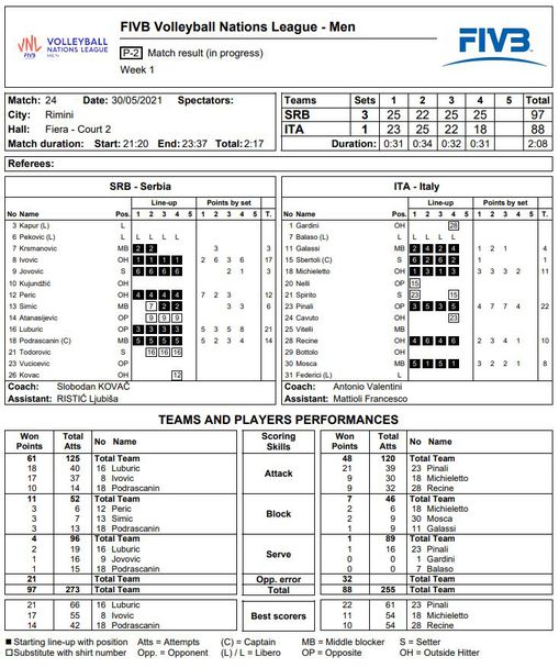 За Италия диагоналът Джулио Пинали заби 22 точки (1 ас), а Алесандро Микелето добави 11 точки (2 блока).