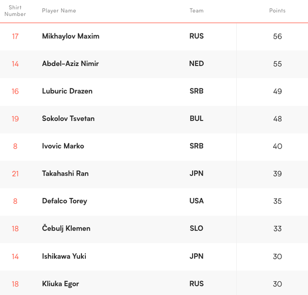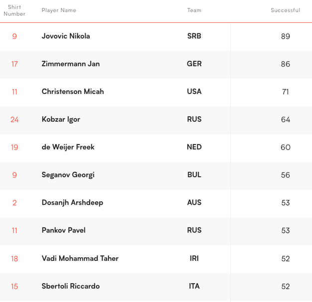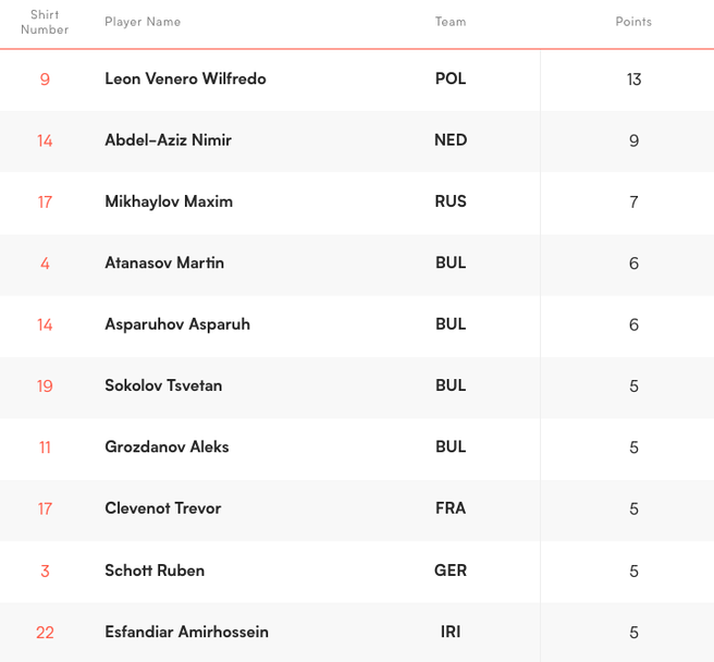 Цветан Соколов и Алекс Грозданов са 6-и и 7-и с по 5 аса. Лидер е поставилият рекорд в надпреварата по брой асове в един мач - Вилфредо Леон - с 13 точки, постигнати само в двубоя Полша - Сърбия (3:1).