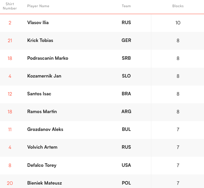 Алекс Грозданов е 7-и при блокировачите със 7 точки от блокада. Класацията се оглавява от Иля Власов (Русия) с 10 блока, а Тобиас Крик (Германия) и Марко Подрасчанин, които имат по 8 блокади.