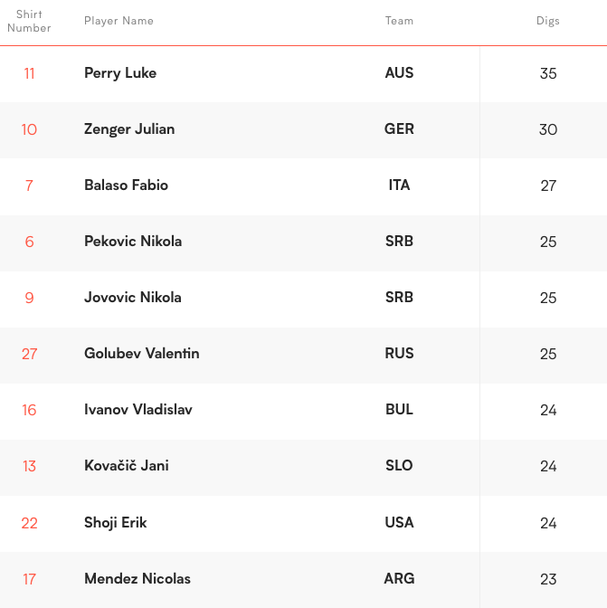 Първи е австралиецът Люк Пери с 35 спасявания, втори е германският национал Юлиан Ценгер с 30.