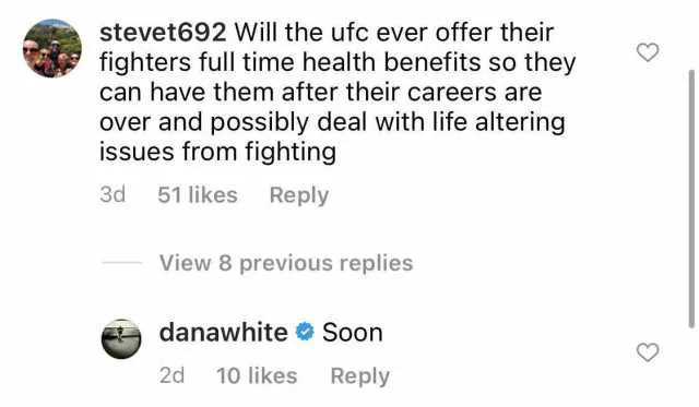 Уайт се включи в серия от въпроси и отговори в Instagram. Там той бе запитан дали бойците на UFC ще получат осигурени здравни грижи дори и след края на кариерата им в UFC, заради травмите и здравословните проблеми, които могат да настъпят от проведените битки в организацията.
